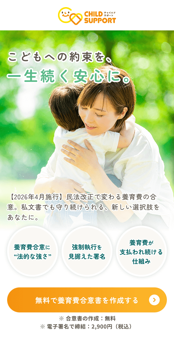チャイルドサポートサインは、養育費合意を口約束で終わらせず、養育費支払合意書にすることに特化したサービスです。上記のような詳細を取り決める場合には、チャイルドサポートの離婚協議書または公正証書作成支援に関してお問い合わせください。
