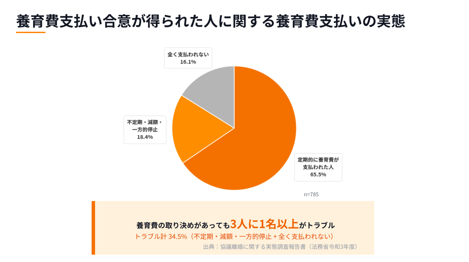 養育費の支払い合意をした人のうち、3人に1人以上(34.5%)が養育費の支払いトラブルを経験しています。
