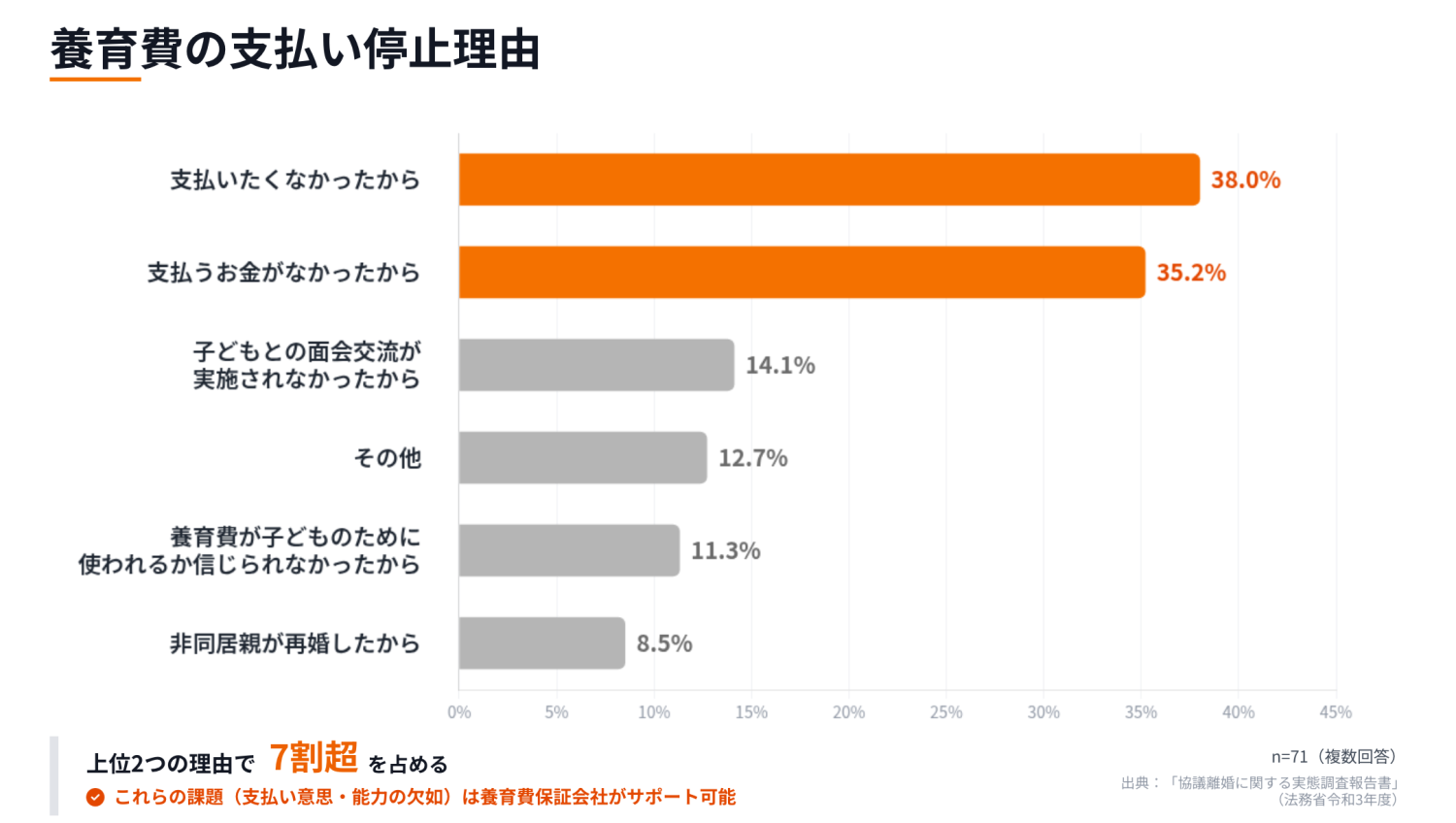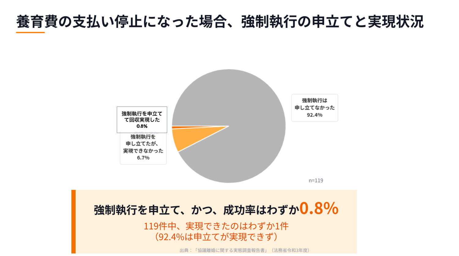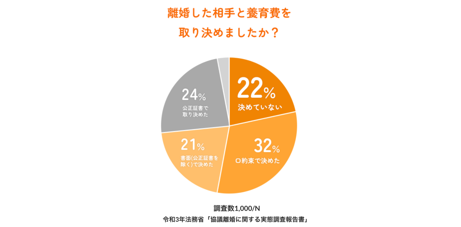 令和3年の法務省調査によると、協議離婚で養育費の取り決めを書面化できた人は約45%です。