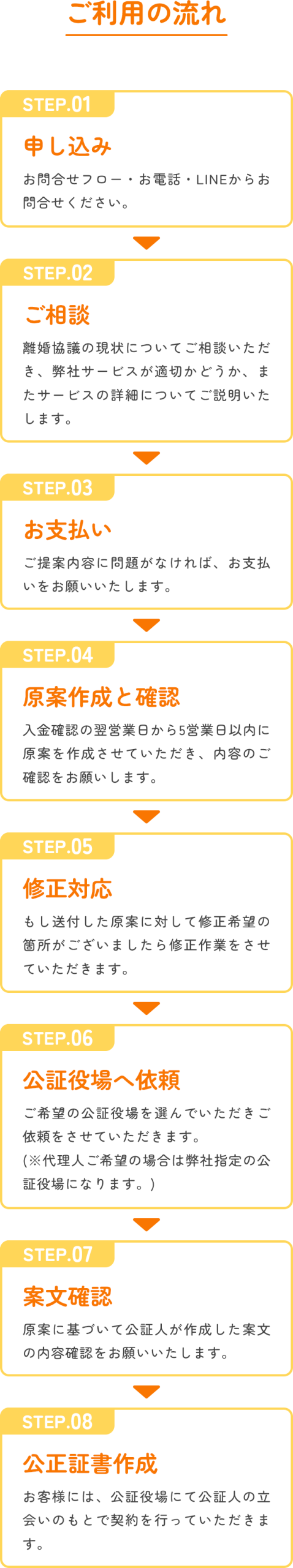 公正証書の原案作成、公証人との調整、予約手続きまで全て含めた金額として一律34,800円(税込)にて対応しております。
