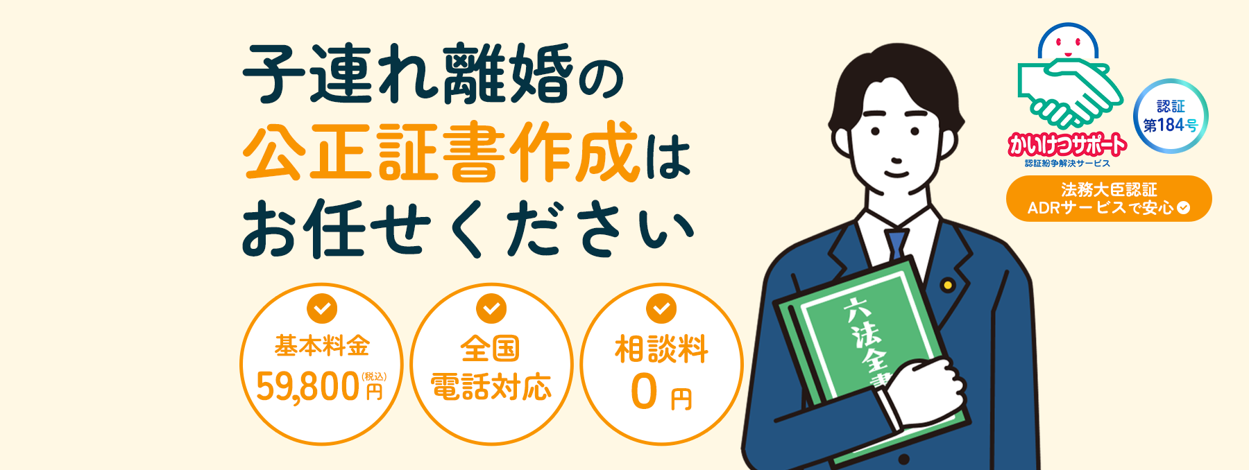 ただし、当社のサービスは、当事者の代理人となることを想定したサービスではありません。あくまで、お二人で合意形成を促し、合意内容を法的に問題ない形で公正証書にすることを目的とするものです。